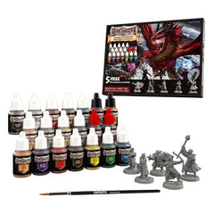 This epic paint set contains not only a full party of 5 fantastic, highly detailed miniatures – it also includes a Starter Brush and 19 of the most essential colours you need plus 1 brush-on-primer (20 paints in total) to paint your party of heroes and heroines fighting the foul monsters, dragons, and evil creatures lurking in dark dungeons or above ground.