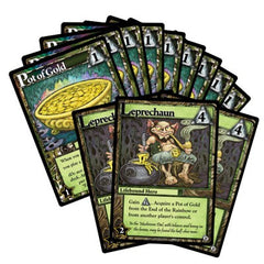 The Leprechaun pack has 12 cards – 3 Leprechauns, a lifebound hero that goes in the Center Deck, and 9 Pots of Gold, lifebound constructs that set off to the side in the “End of the Rainbow” zone. Recruit a Leprechaun to help you horde the gold, and get rewarded for getting as many Pots of Gold as you can! Leprechaun also lets players steal gold from other players, so keep on the lookout for other players taking advantage of the little folk to steal your gold!