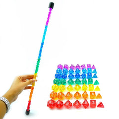 Comes with 7 different coloured sets of mini-dice (d4, d6, d8, d10, percentile, d12, d20).