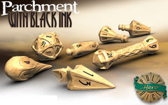 Each 7-piece set of Wizard dice consists of a d4 Bolt, d6 Fireball, d8 Scroll, d10/d100 Potions, d12 Wand, and d20 Orb.